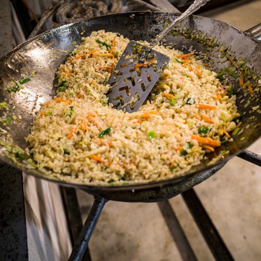 Fragrant stir-fried rice tossed with tender chicken, scrambled egg, mixed vegetables, and green onions in a savory soy-based sauce. A classic favorite, packed with flavor in every bite.